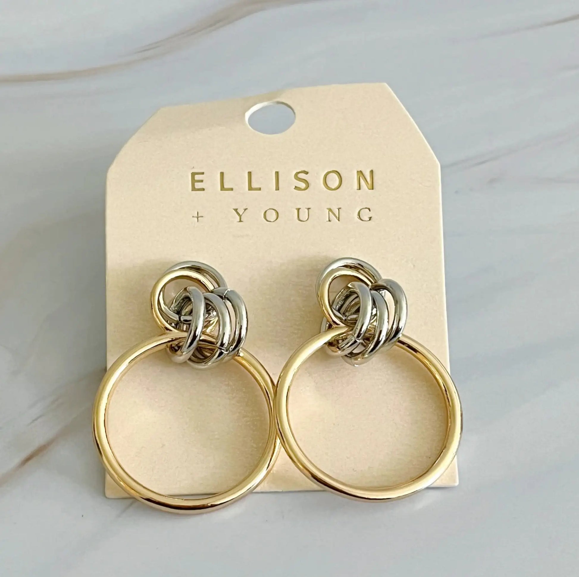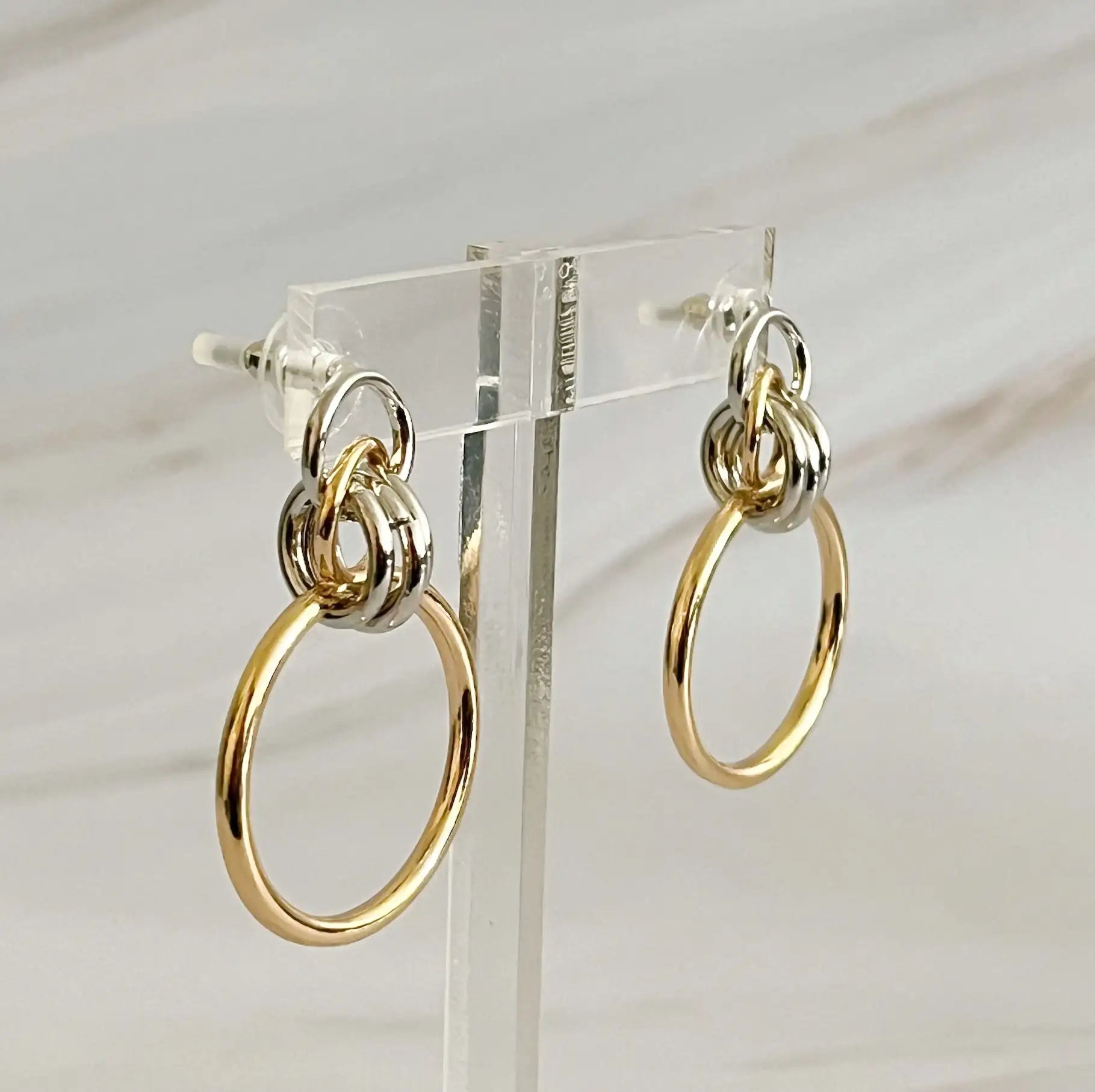 These beautiful and unique hoop earrings, adorned with both gold and silver accents, will elevate any outfit. The perfect statement piece for any occasion, these earrings exude style and sophistication. The intricate design will surely turn heads and add a touch of elegance to your look.
